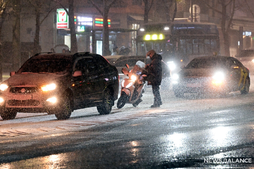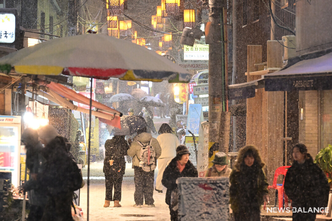 [뉴스밸런스 = 송재우 기자] 서울·인천·경기·강원 등 4개 시도에 대설특보가 발효된 4일 오후 서울 광화문 인근에는 앞이 보이지 않을 만큼의 폭설이 내리고 있다.