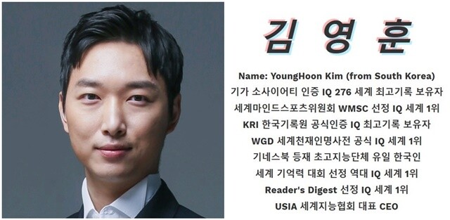 ▲역가상 가장 높은 IQ를 가진 사람으로 선정된 김영훈씨와 그의 IQ 관련 주요 이력. /김연훈씨 페이스북 및 홈페이지 캡처 |
