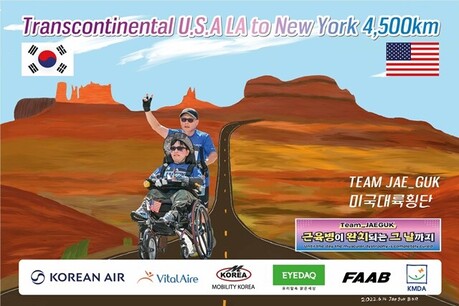 | ▲60세 아버지가 선천성 난치병 근이양증으로 온 몸이 경직된 30세 아들을 휠체어에 태워 달리는 ‘팀 재국’이 로스앤젤레스에서 뉴욕까지 약 4,500km를 달려는 미국 대륙 횡단 도전에 나선다. /배종훈씨 제공 |