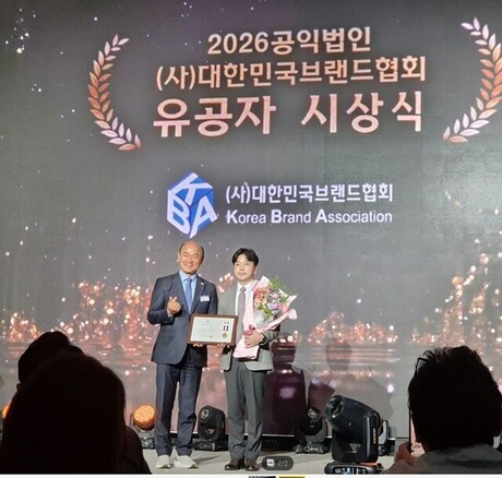 | ▲김대홍 ㈜나인박스 대표(오른쪽)가 지난 22일 서울 올림픽파크텔 올림피아홀에서 열린 ‘2026 공익법인 (사)대한민국브랜드협회 유공자 시상식’에서 서울특별시의회 의장상을 수상한 뒤 기념촬영을 하고 있다. /나인박스 제공 |