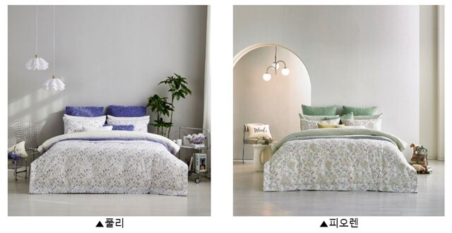 자연을 모티브로 한 디자인은 소재 특성과 조화를 이루며 편안한 분위기를 연출한다. 풀리는 보랏빛이 감도는 차분한 네이비 색상의 섬세한 플라워 패턴이 어우러져 세련되고 도시적인 분위기를 완성해준다. 피오렌은 마치 봄 정원을 옮겨 놓은 듯한 스타일로, 꽃과 잎사귀 패턴이 균형 있게 배치되어 화사하면서도 정돈된 공간미를 연출한다.