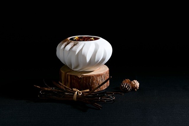 ‘크리스탈 바닐라’는 훈연한 바닐라를 저온에서 천천히 조리해 천연 당분과 오일이 캐러멜라이즈 된 풍미를 살린 케이크다. 부드러운 스펀지에 카카오 닙을 더해 바삭하고 흙 내음 나는 질감을 더했으며, 오아비카 겔로 마무리해 훈연의 깊은 향과 달콤함, 미묘한 쌉싸름함이 조화를 이루는 세련된 디저트를 완성했다.