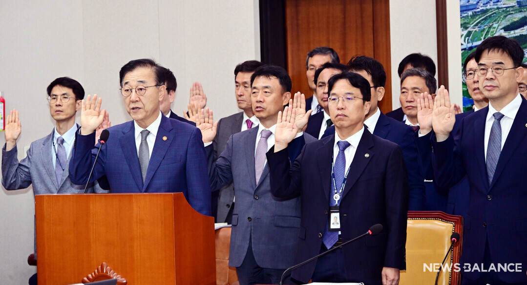 [뉴스밸런스 = 송재우 기자] 김윤덕 국토교통부 장관이 13일 오전 서울 여의도 국회에서 진행된 국토교통부 등에 대한 국정감사에서 선서를 하고 있다.
