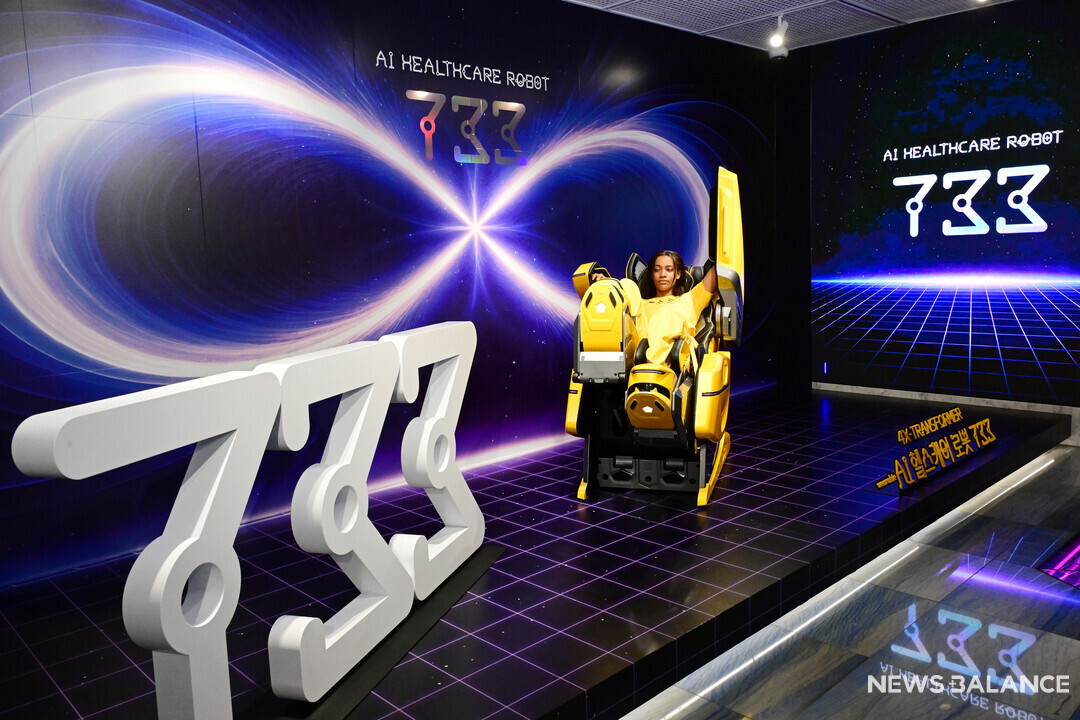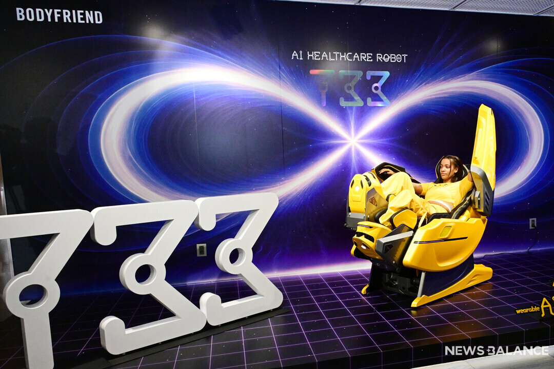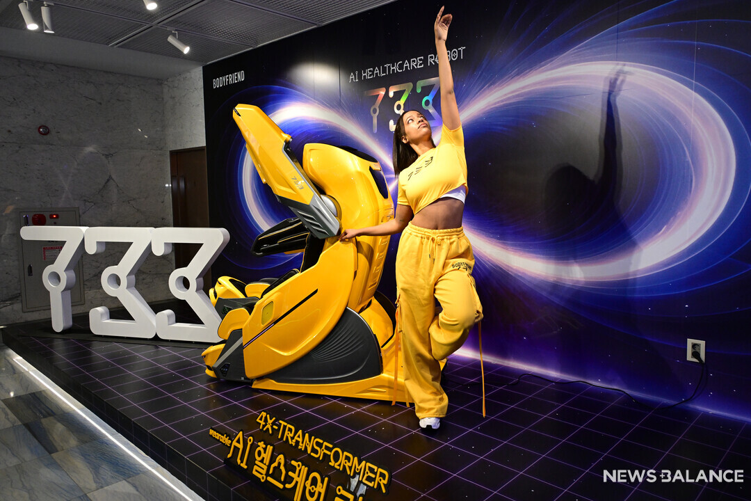 [뉴스밸런스 = 송재우 기자] 24일 서울 강남구 바디프랜드 도곡타워에서 진행된 웨어러블 'AI 헬스케어로봇 733' 출시 행사에서 모델이 제품과 함께 포즈를 취하고 있다.