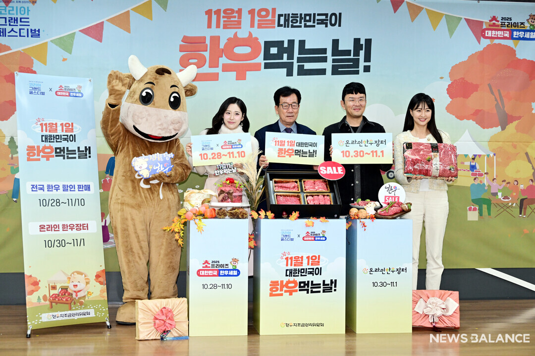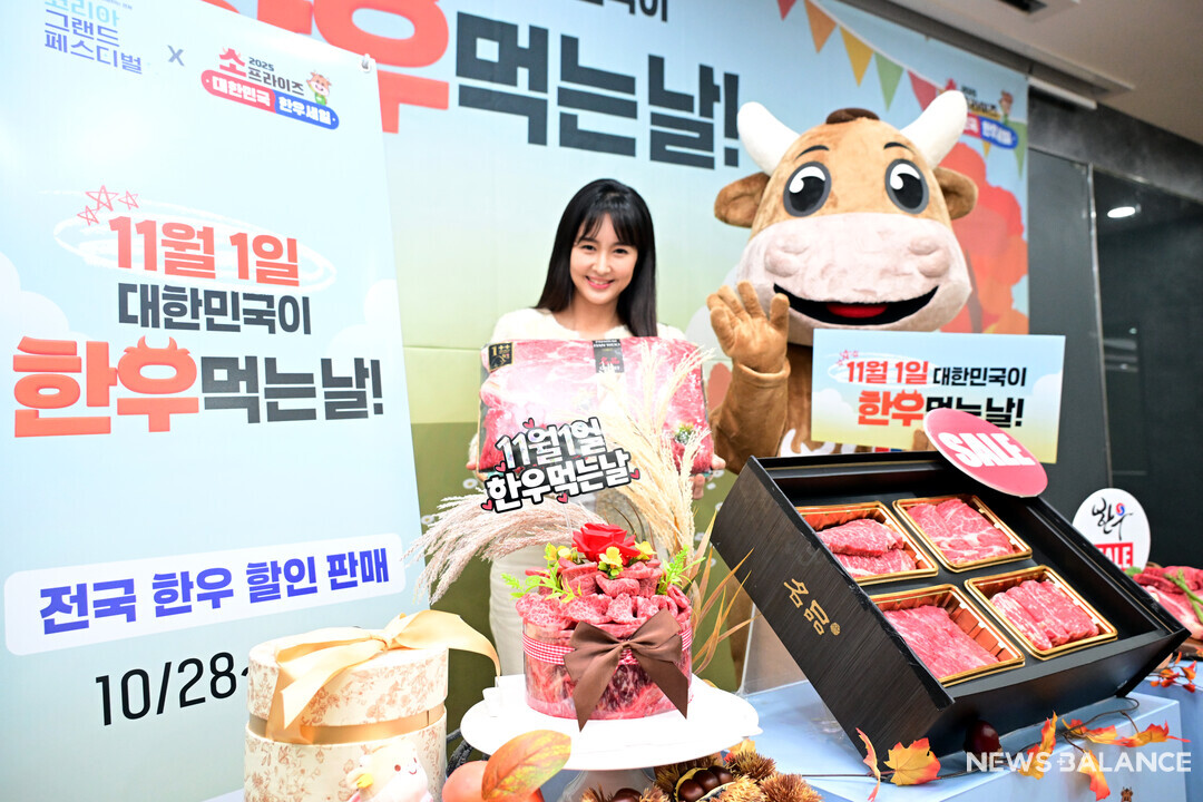 [뉴스밸런스 = 송재우 기자] 28일 오전 서울 종로구 교원 챌린지홀에서 한우자조금관리위원회가 주최한 ‘11월 1일 대한민국이 한우먹는날’ 맞이 한우 할인판매 포토행사에서 홍보모델과 한우자조금 캐릭터가 전국 온·오프라인 대규모 한우 할인 행사를 알리고 있다.