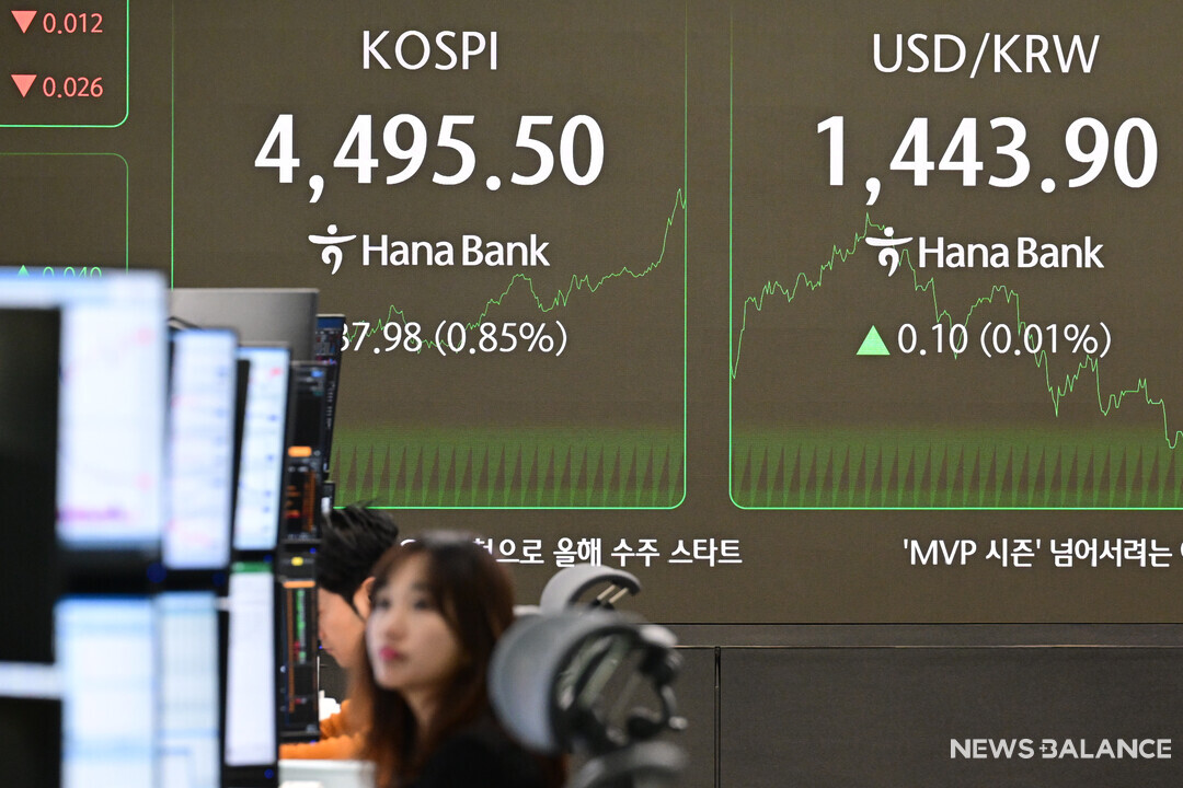 [뉴스밸런스 = 송재우 기자] 코스피가 장중 상승 전환해 사상 처음 4,495를 돌파했다. 6일 오후 서울 중구 하나은행 딜링룸 현황판에 코스피가와 원/달러 환율 등이 표시돼 있다.