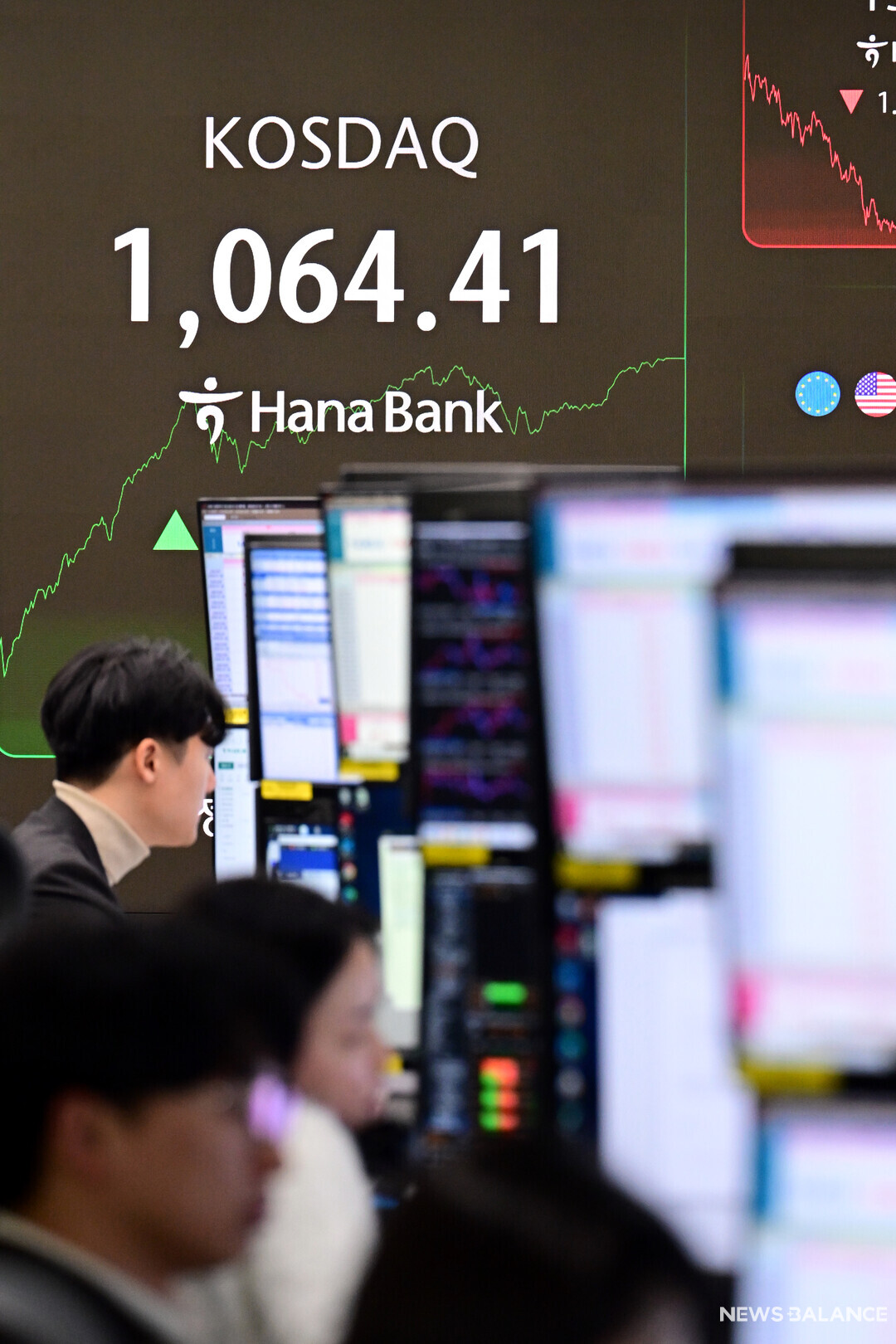 [뉴스밸런스 = 송재우 기자] 코스닥 급등에 매수 사이드카가 발동되며 '천스닥'으로 마감한 26일 오후 서울 중구 하나은행 딜링룸 현황판에 코스닥 지수 등이 표시되고 있다.