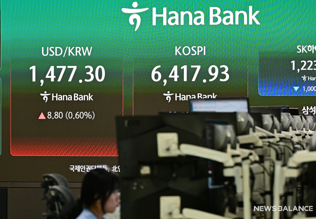 [뉴스밸런스 = 송재우 기자] 22일 오후 서울 중구 하나은행 본점 딜링룸 현황판에 코스피가 표시돼 있다. 이날 코스피는 29.46포인트(0.46%)오른 6417.93으로 마감했다.