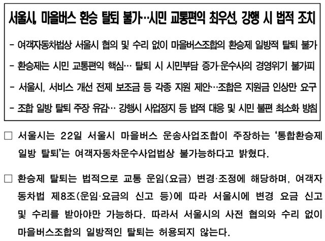 24일 서울시에 따르면 시는 23일 보도로자를 통해 “환승제 탈퇴는 법적으로 교통 운임 변경·조정에 해당하며 여객자동차법 8조에 따라 서울시에 변경 요금 신고 및 수리를 받아야만 가능하다”며 “사전 협의와 수리 없이 일방적인 탈퇴는 허용되지 않는다”고 밝혔다.