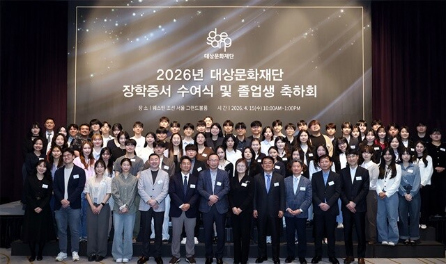 | ▲대상문화재단이 지난 15일 개최한 ‘2026년도 장학증서 수여식 및 졸업생 축하회’에서 국내외 대학(원)생과 학부모, 외국인 유학생을 비롯해 대상그룹 관계자 및 내빈들이 기념 사진을 촬영하고 있다. /대상문화재단 제공 |
