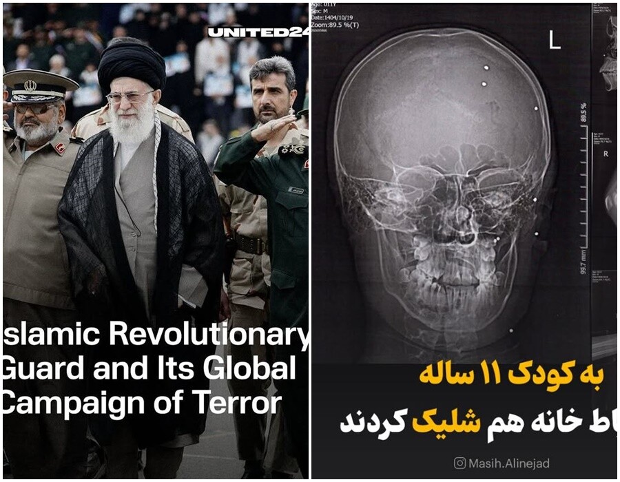 | 이란 최고 지도자인 알리 하메네이와 산탄총을 맞은 시위대의 엑스레이 사진./마시 알리네자드 소셜미디어 |