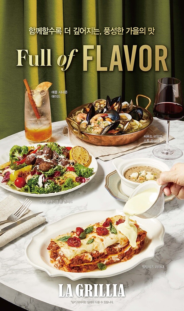 이번에 선보이는 메뉴는 ‘함께 할수록 더 깊어지는, 풍성한 가을의 맛(Full of FLAVOR)’을 테마로 라그릴리아만의 특별한 레시피를 더해 다양한 식재료의 깊은 맛을 살린 것이 특징이라는 게 회사 측의 설명이다.