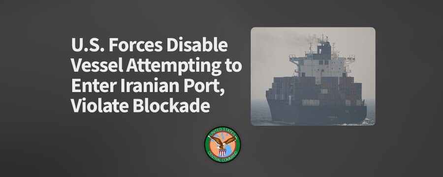 | 미 중부 사령부가 명령을 따르지 않은 이란 화물선을 강제 정지 시킨 사실을 공개했다../소셜미디어 |