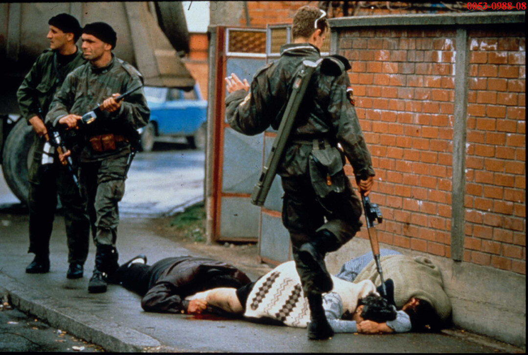 | 보스니아 세르비아 군인들이 민간인들을 학대하고 있다./UN국제형사 재판소 |