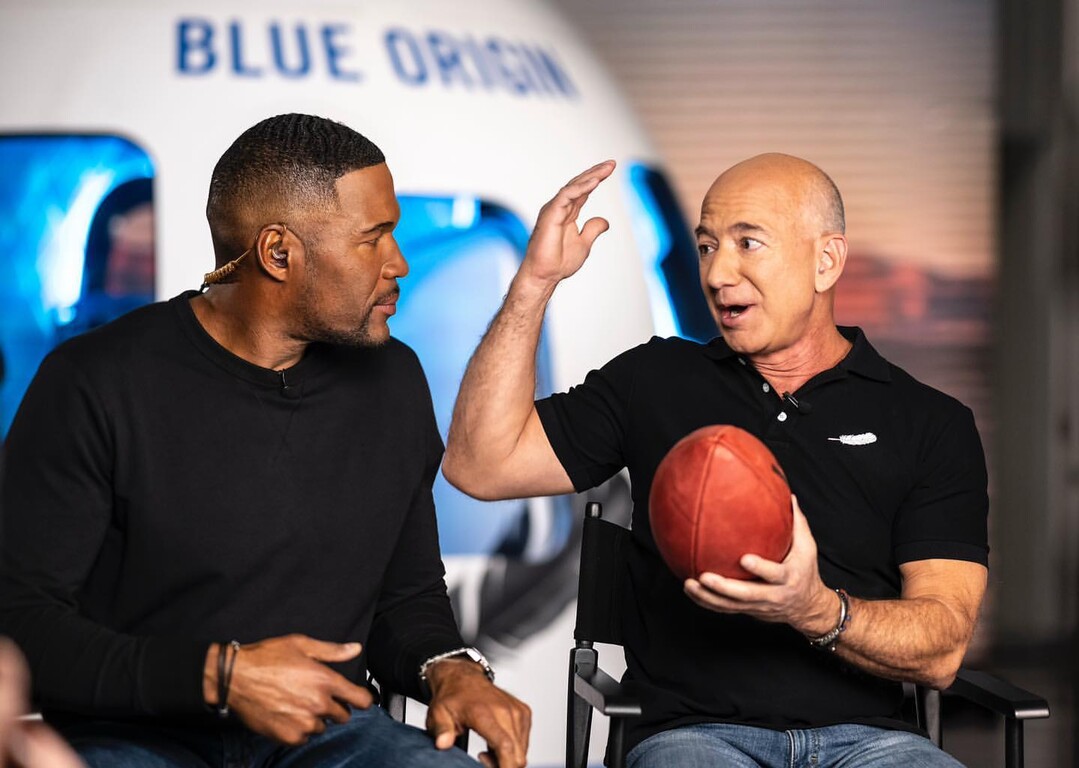 | 베이조스가 아마존의 우주캡슐인 블루 오리온을 뒤에 두고 설명을 하고 있다./소셜미디어 |