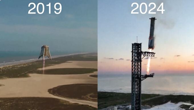 | 일론 머스크의 스페이스 X 우주선이 역추진 로켓을 쏘면서 발사대로 다시 복귀하고 있다./소셜미디어 |
