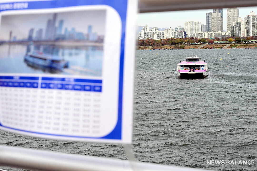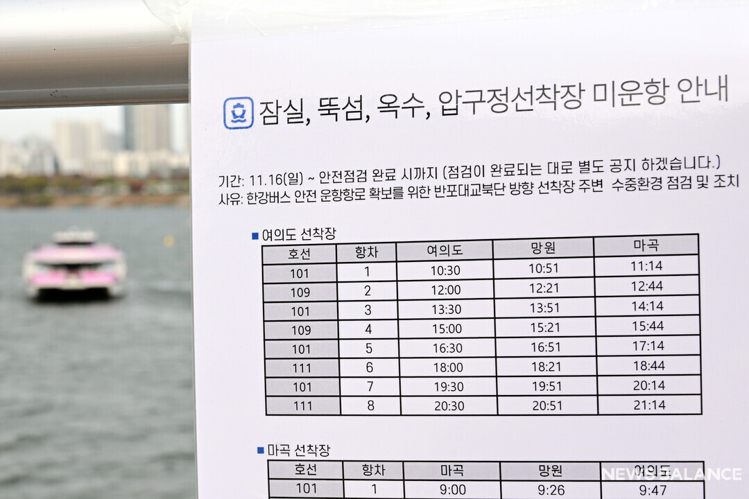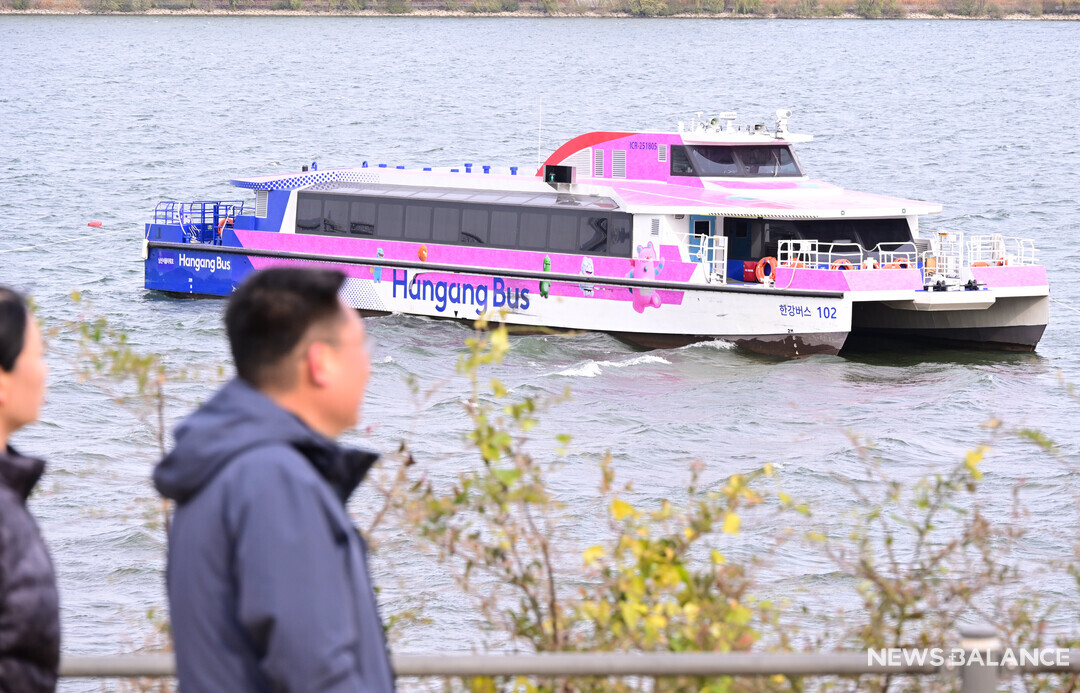 [뉴스밸런스 = 송재우 기자] 지난 15일 밤 잠실선착장 인근 수심이 얕은 곳을 지나다 강바닥에 걸려 멈춘 한강버스를 17일 오전 시민들이 바라보고 있다.