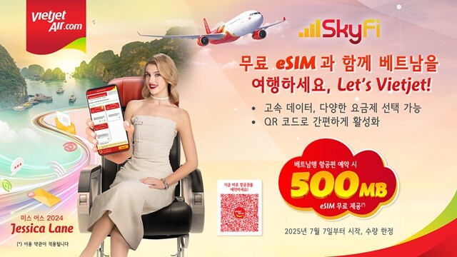 3일 베엣젯항공에 따르면 오는 31일까지 비엣젯항공 홈페이지 또는 모바일 앱을 통해 베트남행 항공권을 예매하는 승객에게 500MB 고속 데이터가 포함된 ‘SkyFi eSIM’을 무료로 제공한다.(재고 소진 시 종료).