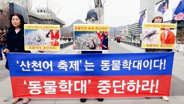| ▲한국동물보호연합 등 5개 동물보호단체들이 6일 오후 서울 광화문 이순신 동상앞에서 기자회견을 열고 산천어 축제 중단을 촉구하고 있다. /한국동물보호연합 홈페이지 |