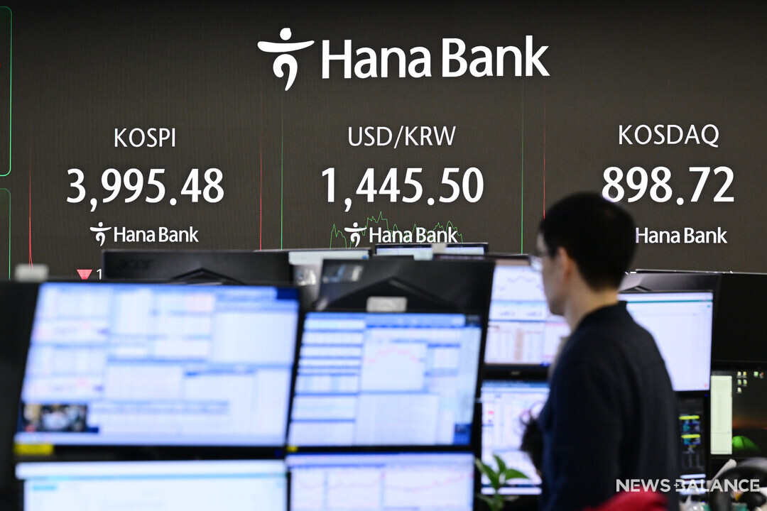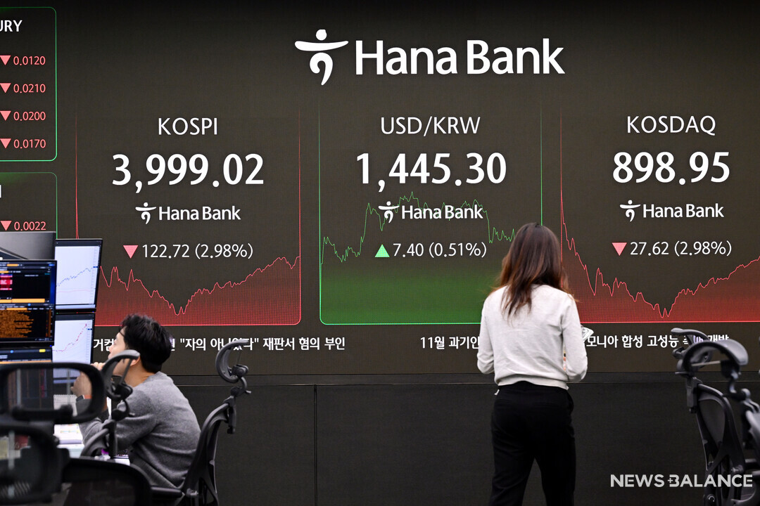 이날 코스피는 전장 대비 1.61% 내린 4055.47에 출발해 장 초반 3867.81까지 떨어졌다. 코스피 4000선이 붕괴된 건 지난달 27일 이후 7거래일 만이다. 오후 들어서는 반등을 시도하며 4000선을 회복했지만 여전히 등락을 반복하고 있다. [송재우 기자 sjw@newsbalance.co.kr]
