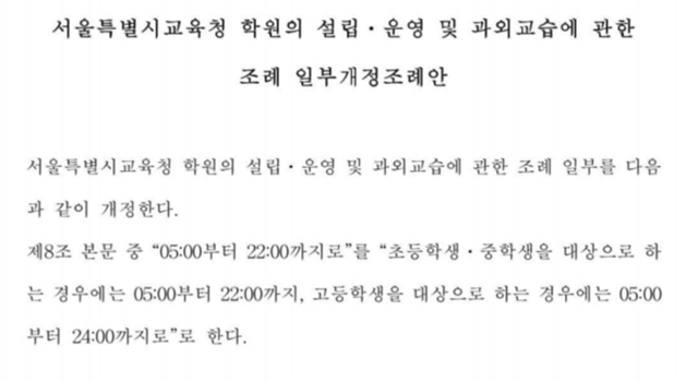 3일 서울시의회와 교육계 등에 따르면 고교생을 대상으로 한 학원의 교습시간을 현행 밤 10시에서 자정으로 연장하는 내용을 담은 ‘서울시교육청 학원의 설립·운영 및 과외교습에 관한 조례 일부개정안’이 지난달 28일 입법예고됐습니다.