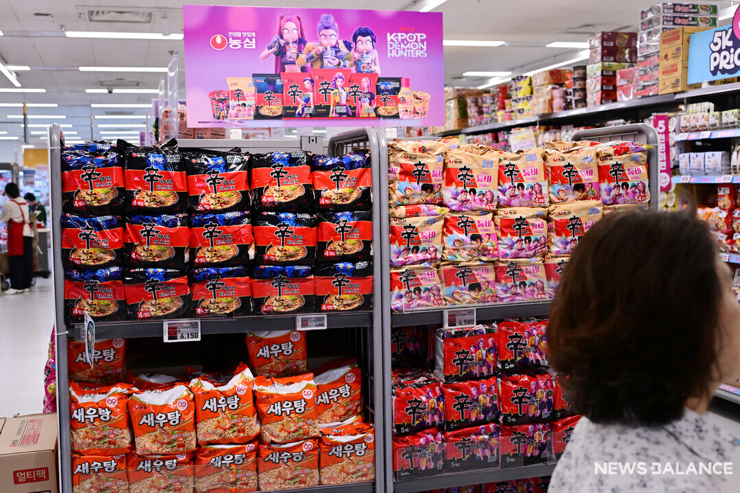 [뉴스밸런스 = 송재우 기자] 넷플릭스 '케이팝 데몬 헌터스(케데헌) 열풍이 지속되는 가운데 서울 한 대형마트에는 케데헌 협업 상품이 진열대를 가득 메우고 있다.