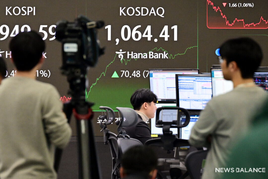 [뉴스밸런스 = 송재우 기자] 코스닥 급등에 매수 사이드카가 발동되며 '천스닥'으로 마감한 26일 오후 서울 중구 하나은행 딜링룸 현황판에 코스닥 지수 등이 표시되고 있다.