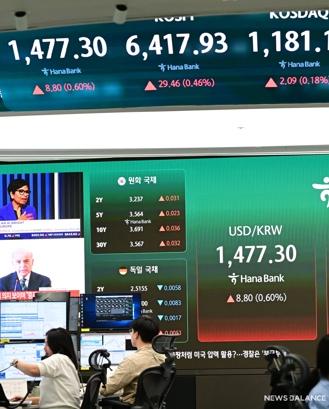 [뉴스밸런스 = 송재우 기자] 22일 오후 서울 중구 하나은행 본점 딜링룸 현황판에 코스피가 표시돼 있다. 이날 코스피는 29.46포인트(0.46%)오른 6417.93으로 마감했다.