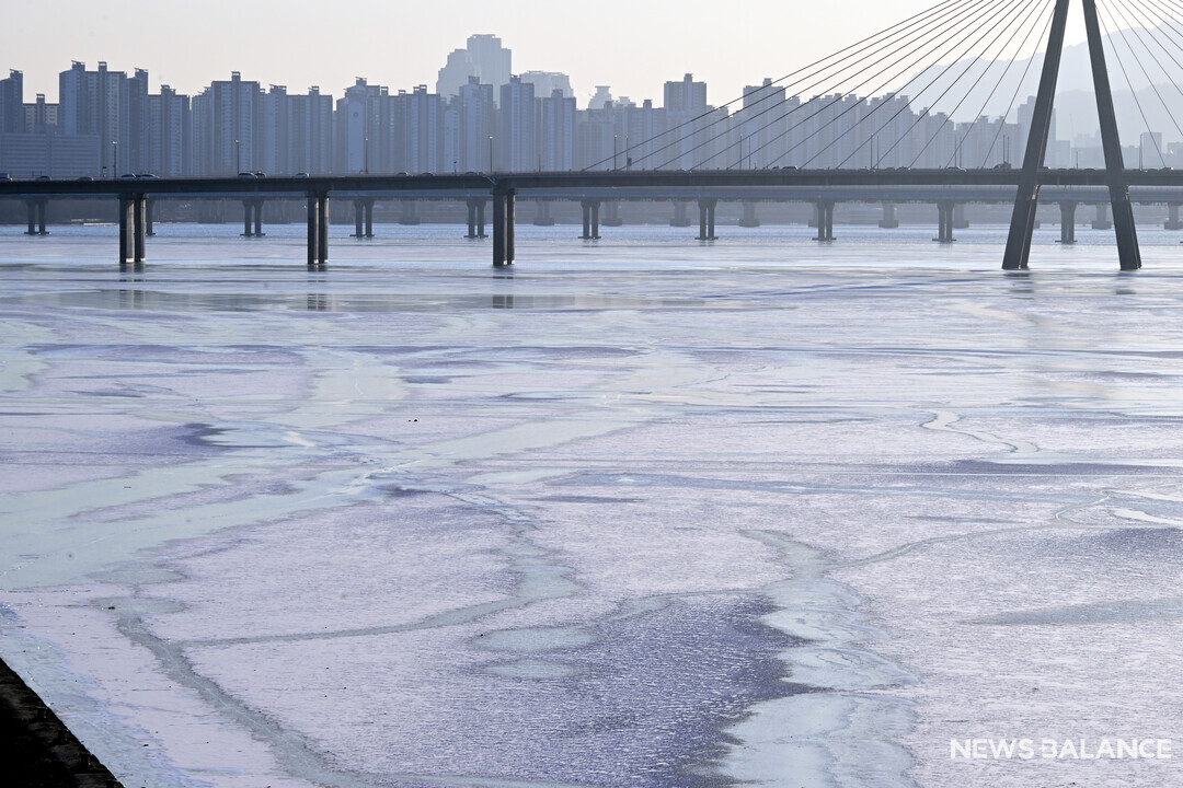 [뉴스밸런스 = 송재우 기자] 계속되는 한파로 인해서 28일 오후 서울 강동구 광진교에서 바라본 한강이 얼어 햇살에 반사되어 빛나고 있다.