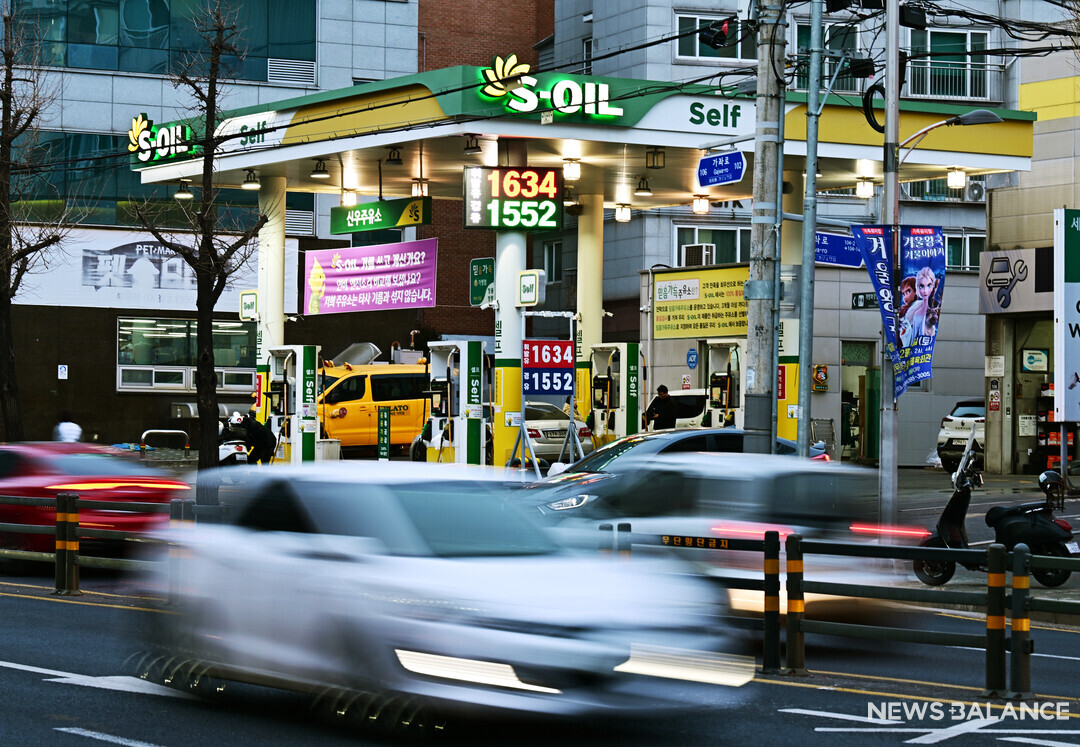 서울에 위치한 한 셀프 주유소에 휘발유와 경유 가격이 표시돼 있다.뉴스밸런스 / 송재우 기자 sjw@newsbalance.co.kr